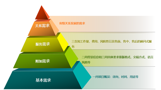 商業(yè)行為中的客戶的需求,概括起來就是“誰”在“什么環(huán)境下”想要“解決什么問題”。借助于馬斯洛需求層次理論模型進行延伸,我們可以通過深入對語言服務產品購買者,即我們的客戶的“需求”進行分析與歸類,將語言服務產品的購買者的需求劃歸為四類,即產品基本需求、產品附加需求、產品服務需求和關系需求。