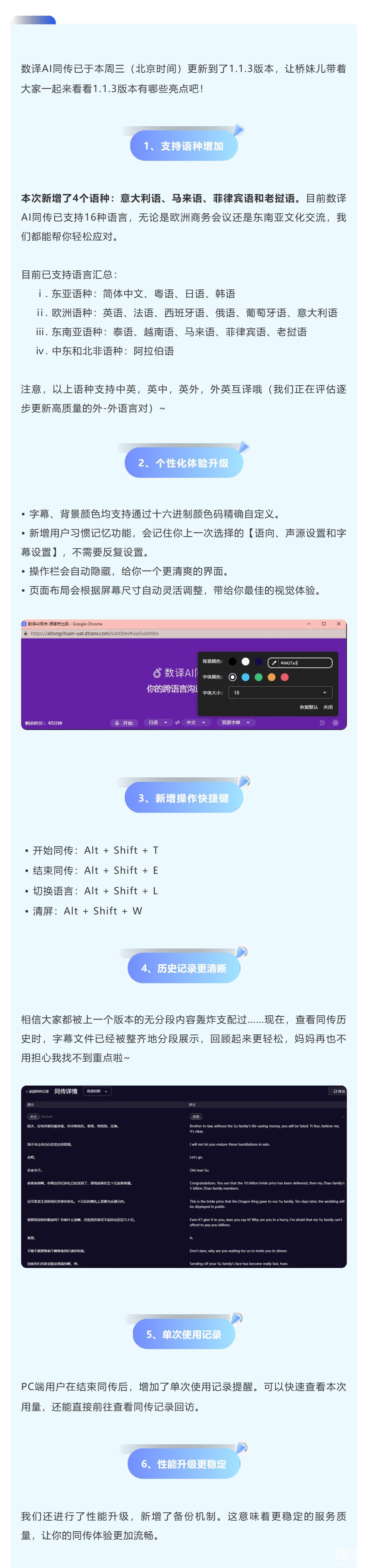 "數譯A同傳又雙叒愛更新啦!上周四我們發布了最新的V1.1.4版本。本次更新帶來了多項實用功能,讓橋妹兒帶大家一起來看看吧~ "...[查看更多]